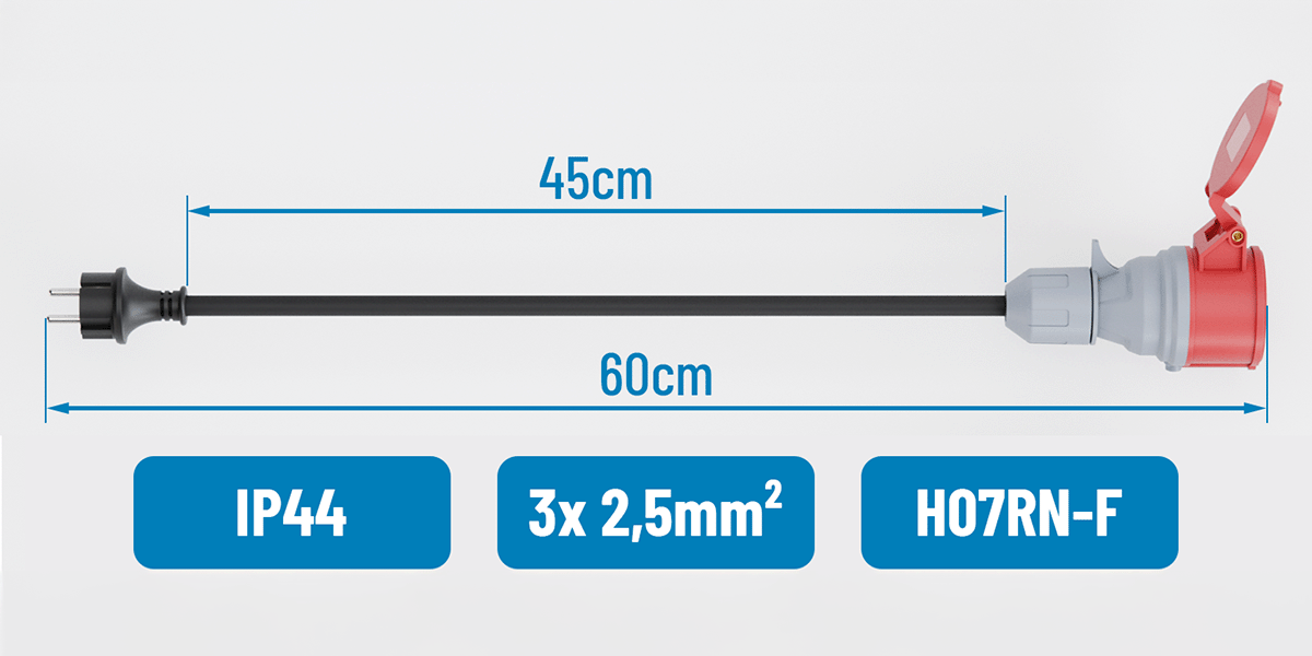 - Robust & wasserdicht nach IP44 - Der Adapter 220V einphasig ist für den Einsatz im Freien geeignet und bietet Schutz gegen Spritzwasser & Staub - Robuster PVC CEE Adapter 16A mit 60 cm Gummischlauchleitung.