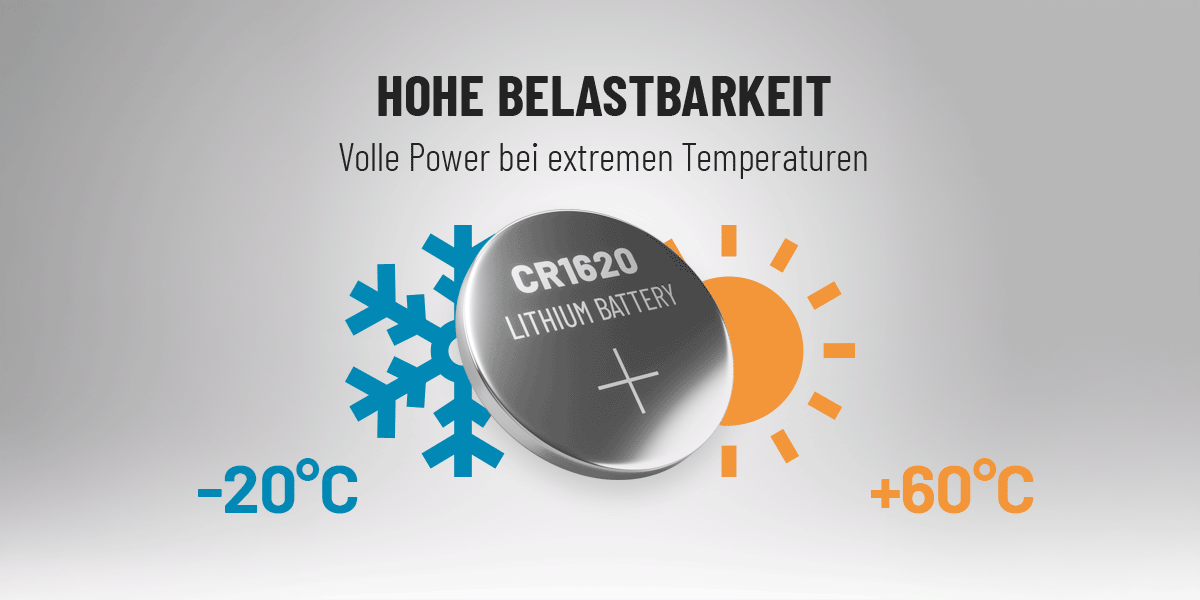 - Robust – Die CR1620 Batterie ist temperaturbeständig von -20°C bis +60°C und für extreme Bedingungen geeignet.