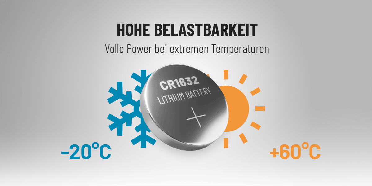 - Robust – CR 1632 Knopfzellen sind temperaturbeständig von -20°C bis +60°C und ideal für extreme Bedingungen.